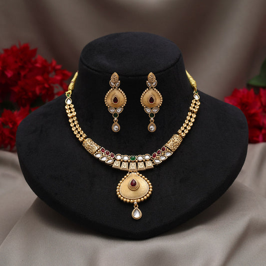Multi Color Matte Gold Rajwadi Temple Necklace Set (TPLN658MLT)