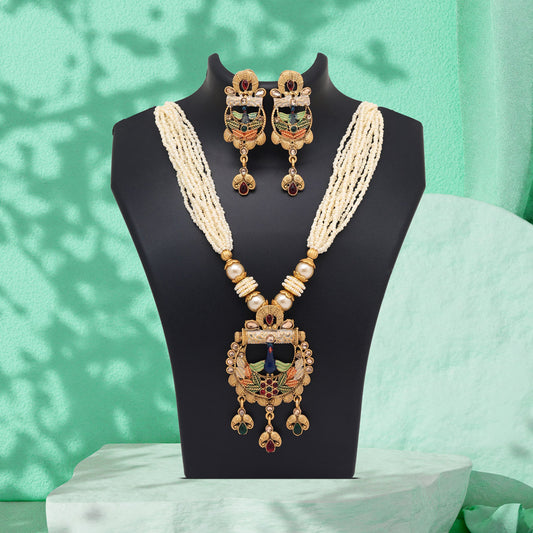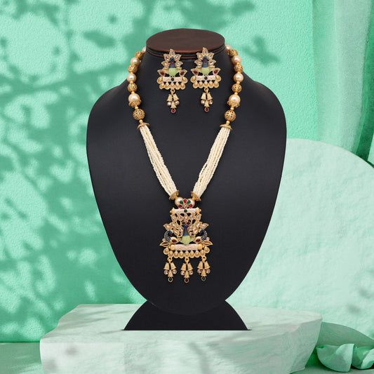 Multi Color Matte Gold Rajwadi Temple Necklace Set (TPLN676MLT)