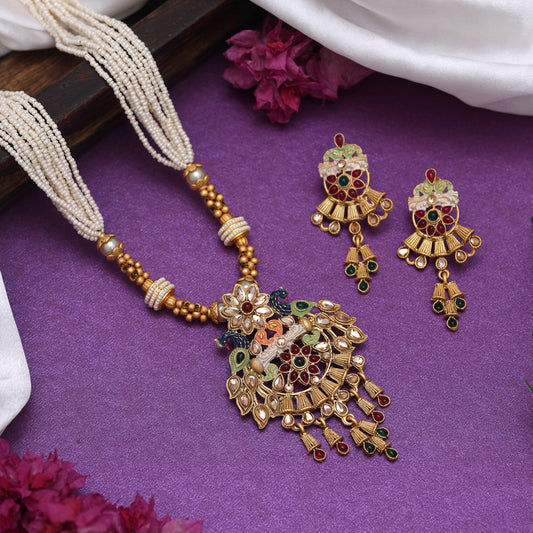 Multi Color Matte Gold Rajwadi Temple Necklace Set (TPLN679MLT)