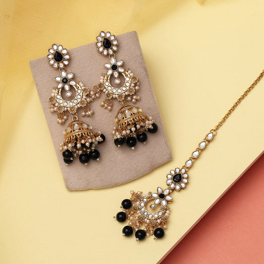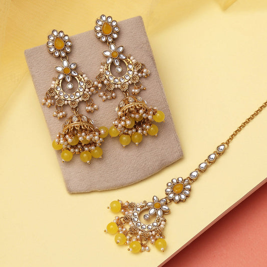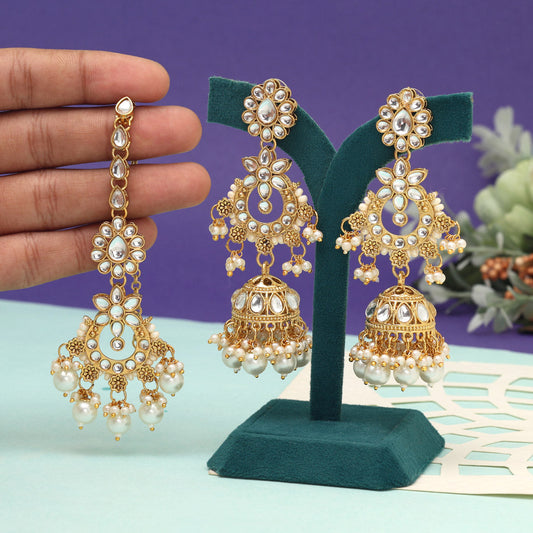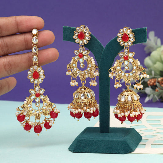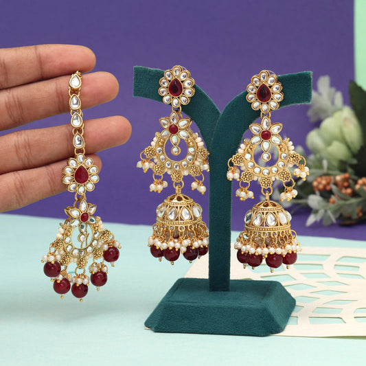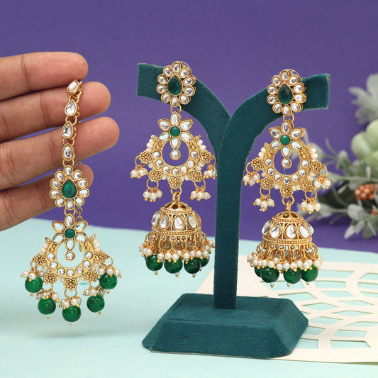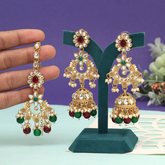 Maroon & Green Color Kundan Earrings With Maang Tikka