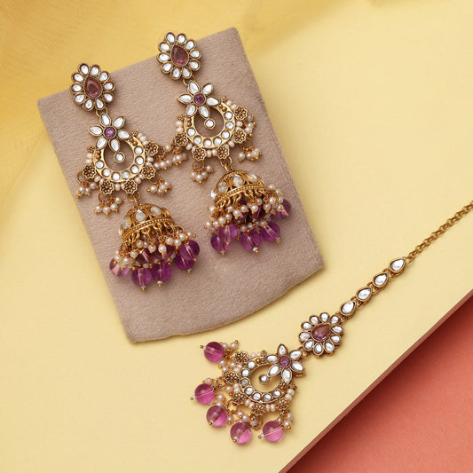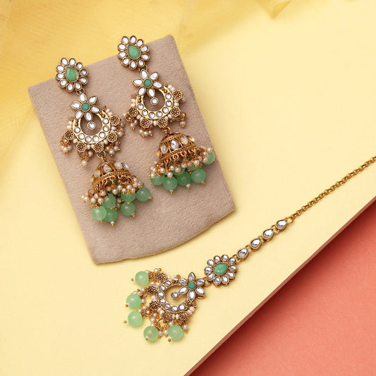 Pink & Pista Green Color Kundan Earrings With Maang Tikka