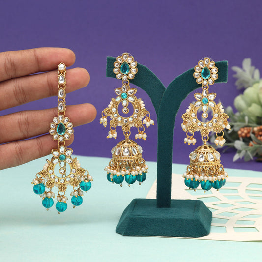Turquoise Blue Color Kundan Earrings With Maang Tikka