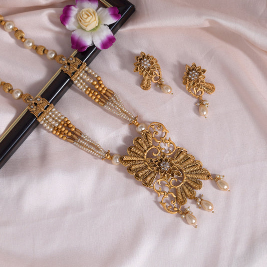 Gold Color Long Matte Gold Rajwadi Temple Necklace Set (TPLN522GLD)