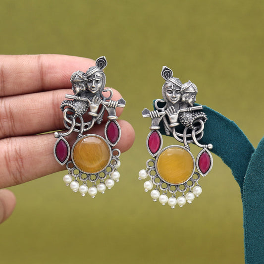 Mustard Yellow Color Lord Radha Krishna Monalisa Stone Oxidised Earrings (GSE2837MYLW)