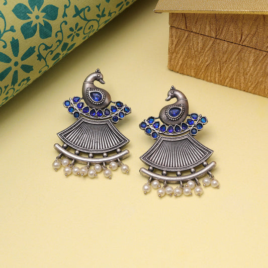Blue Color Oxidised Fashion Earrings With Fine Metal Cut Work Detailing