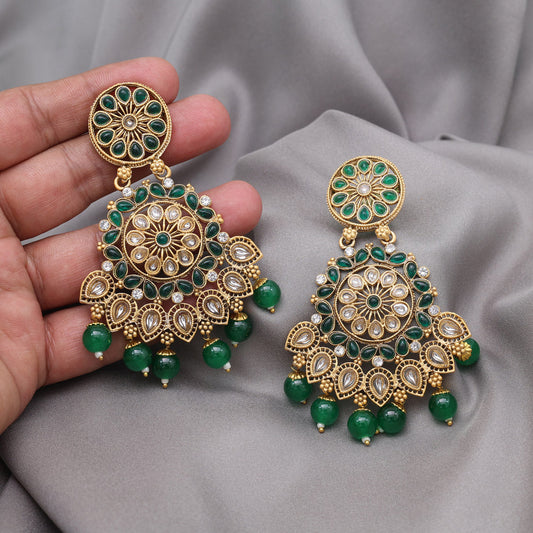 Green Color Rajwadi Matte Gold Earrings (MGE328GRN)