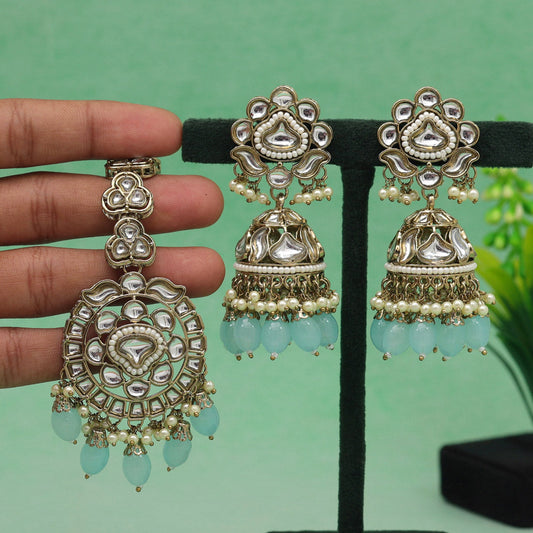 Sky Blue Color Kundan Earrings With Maang Tikka (KDTE552SBLU)