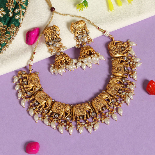 White Color Rajwadi Matte Gold Necklace Set (TPLN418WHT)