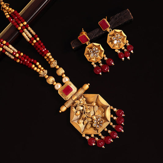 Maroon Color Vilandi Kundan Long Matte Gold Rajwadi Temple Necklace Set (TPLN474MRN)