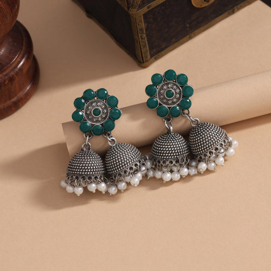 Green Color Oxidised Earrings With Artistic Design And Antique Finish