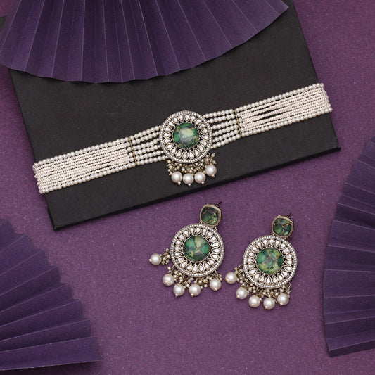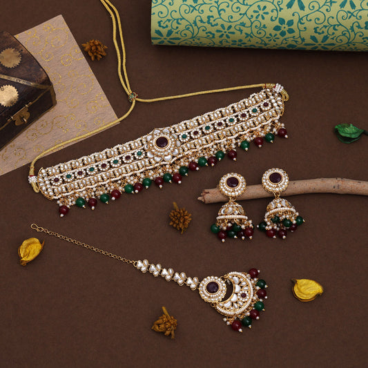 Maroon & Green Color Choker Kundan Necklace Set With Royal Fusion Style