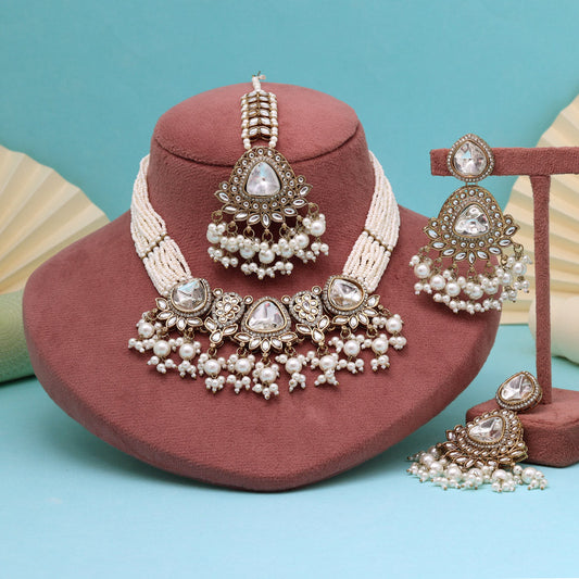 Pink Color Choker Kundan Necklace Set With Pearl Bead Droplets