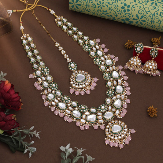 Pink & Pista Green Color Meena Work Kundan Necklace Set For Bridesmaids