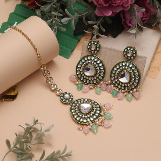 Green Color Meena Work Kundan Necklace Set For Graceful Day Events