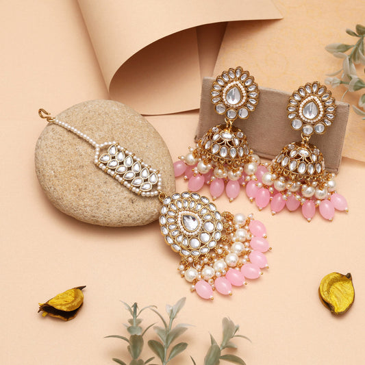 Pink Color Kundan Necklace Set With Classic Design And Sparkling Stones