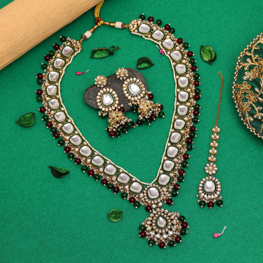 Maroon & Green Color Kundan Necklace Set Crafted For Wedding Functions
