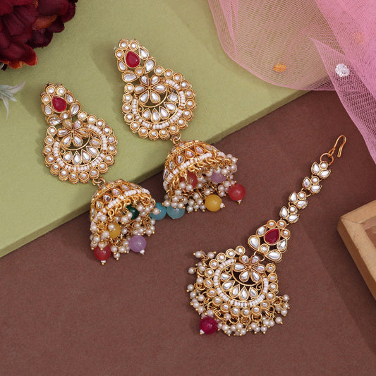 Multi Color Kundan Earrings With Maang Tikka (KDTE574MLT