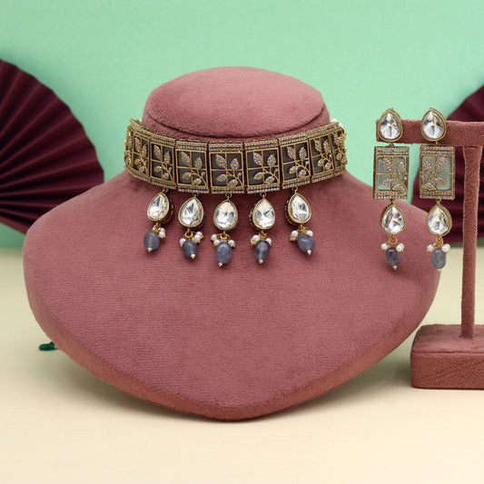 Grey Color Unique Brass Choker Necklace With Ad And Moissanite Stone (CZN1065GRY)