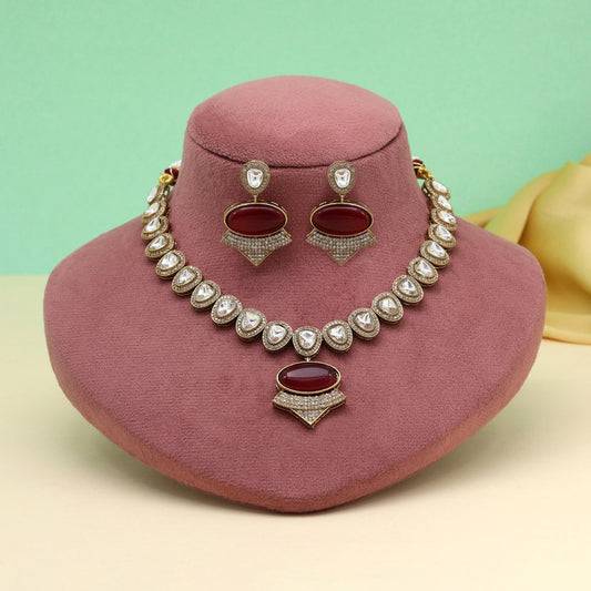 Maroon Color Handmade Jaipur American Diamond Necklace With Monalisa Stones