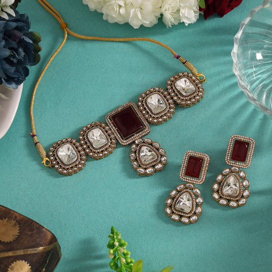Maroon Color Handmade Jaipur Choker Necklace With Moissanite And Monalisa Stones (CZN1067MRN)
