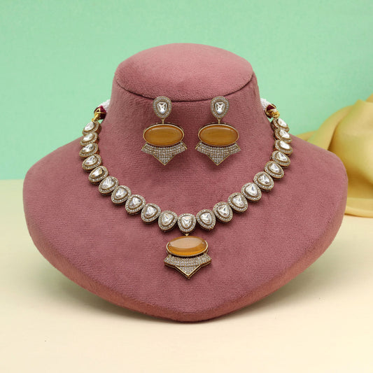 Mustard Yellow Color Handmade Jaipur American Diamond Necklace With Monalisa Stones (CZN1068MYLW)