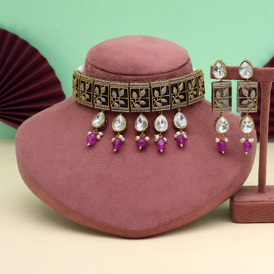 Purple Color Unique Brass Choker Necklace With Ad And Moissanite Stone (CZN1065PRP)