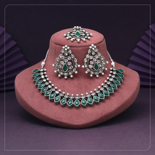 Green Color Oxidised Kundan Necklace Set