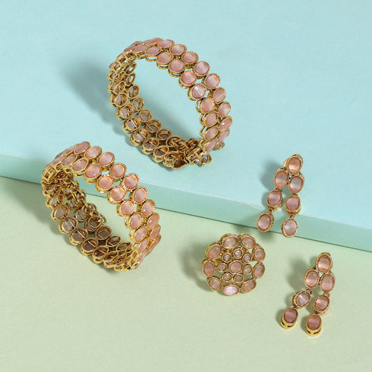 Pink Color 1 Pair Of American Diamond Bracelet & Ring & Earrings (ADB101CMB)