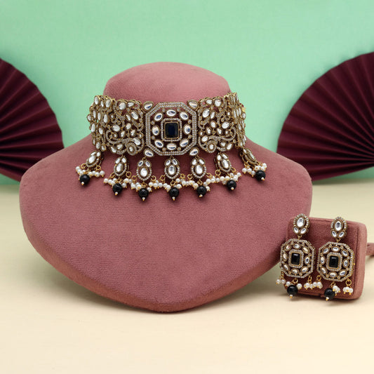 Black Color Premium Jaipur American Diamond Jewellery Brass Choker Necklace With Beautiful Monalisa And Moissanite Stone (CZN1064BLK)