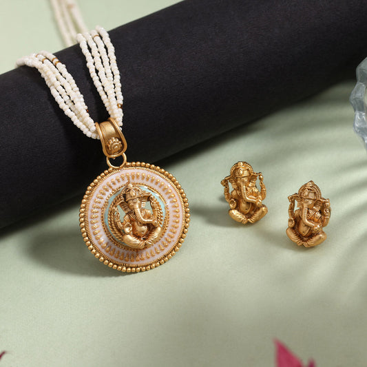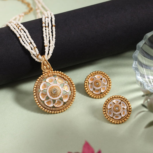 White Color Meena Work Matte Gold Rajwadi Temple Necklace Set (TPLN730WHT)