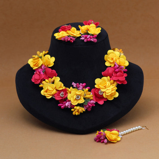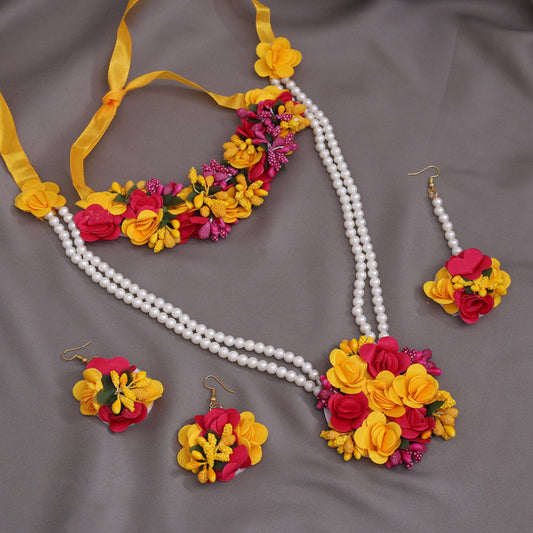 Rani & Yellow Color Synthetic Rose Floral Necklace Set