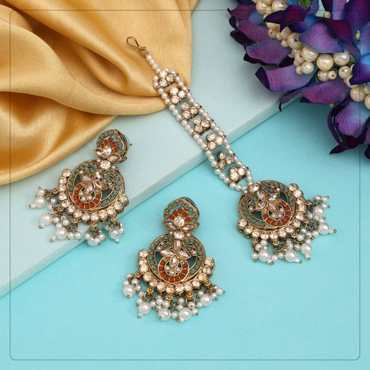 Multi Color Pakistani Kundan Earrings With Maang Tikka (KDTE586MLT)