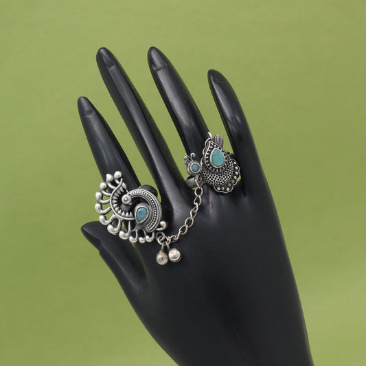 Stylish Sky Blue Color Oxidised Two In One Finger Ring For Girls