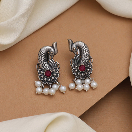 Elegant Off White Color Oxidised Earrings With Delicate Pearl Detailing
