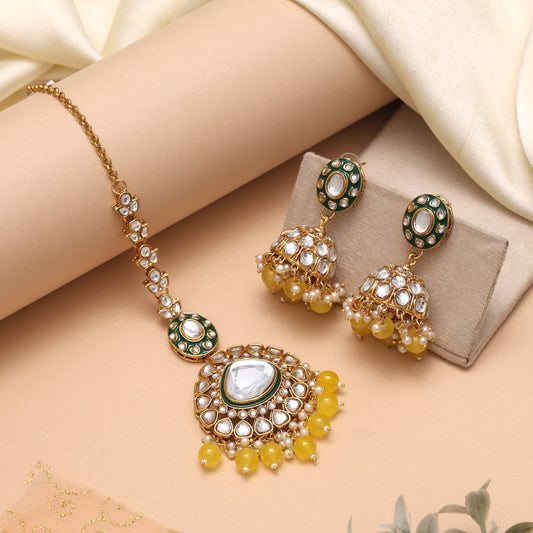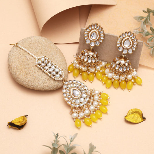 Yellow Color Kundan Necklace Set With Glossy Finish For Festive Events