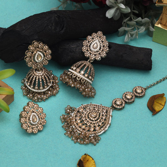 Blush & Mint Pista Green Color Kundan Earrings With Maang Tikka