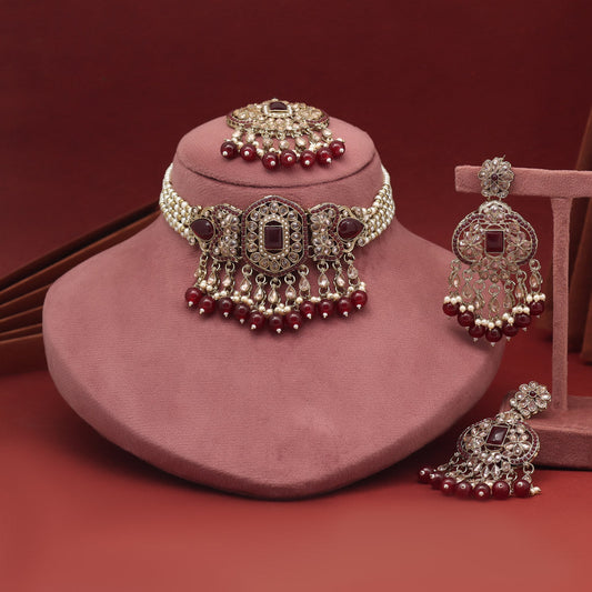 Maroon Color Choker Kundan Necklace Set (KN1464MRN)