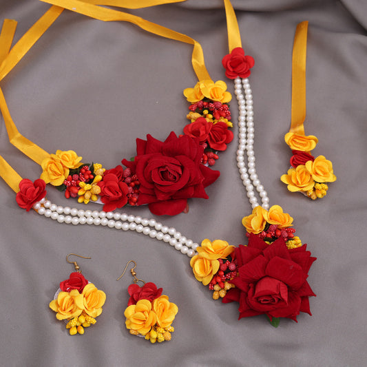 Red & Yellow Color Synthetic Rose Floral Bridal Set