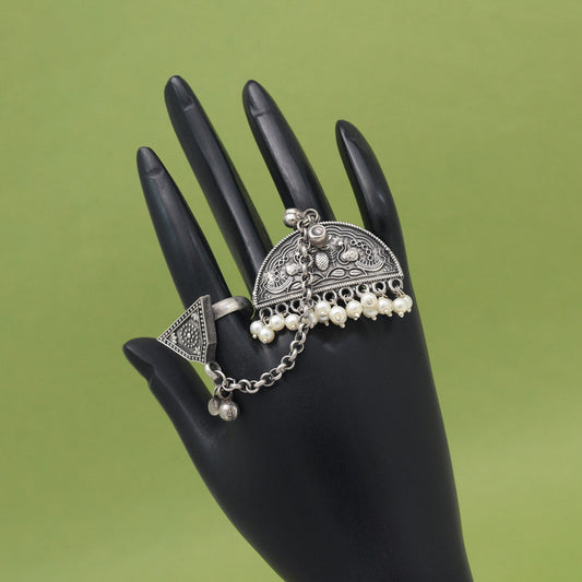 Premium Silver Color Oxidised Two In One Finger Ring For Fashion