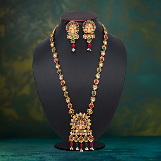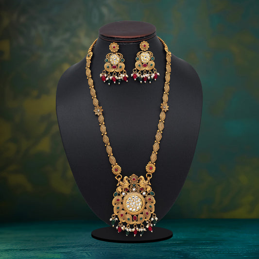 Maroon & Green Color Kundan Matte Gold Rajwadi Temple Necklace Set (TPLN325MG)