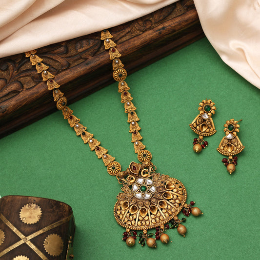 Maroon & Green Color Vilandi Kundan Matte Gold Rajwadi Temple Necklace Set (TPLN323MG)