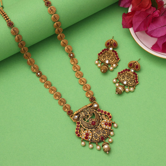 Rani Color Vilandi Kundan Matte Gold Rajwadi Temple Necklace Set (TPLN326RNI)