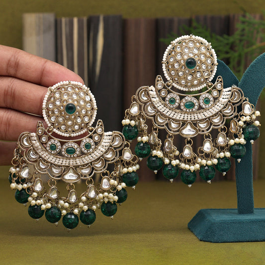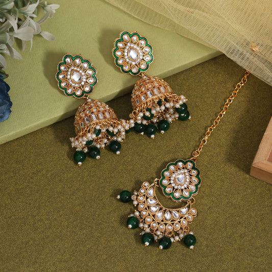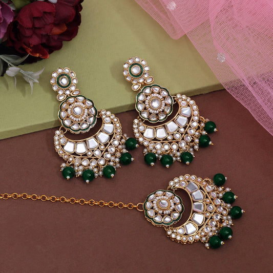 Green Color Kundan Earrings With Maang Tikka (KDTE570GRN