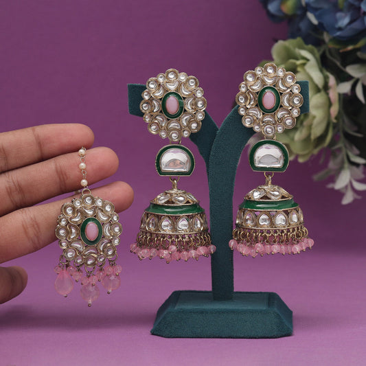 Pink & Pista Green Color Kundan Earrings With Maang Tikka (KDTE569PNKPGRN