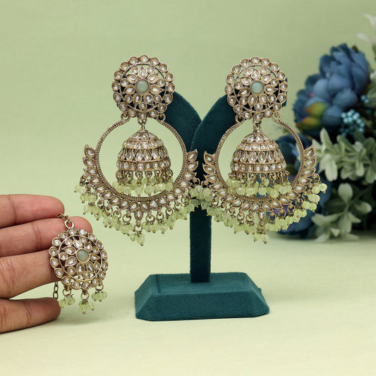 Pista Green Color Kundan Earrings With Maang Tikka (KDTE562PGRN)