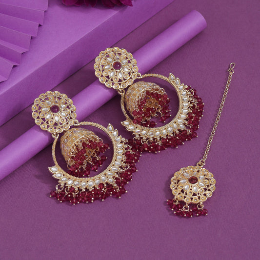 Magenta Color Kundan Earrings With Maang Tikka (KDTE563MNT)