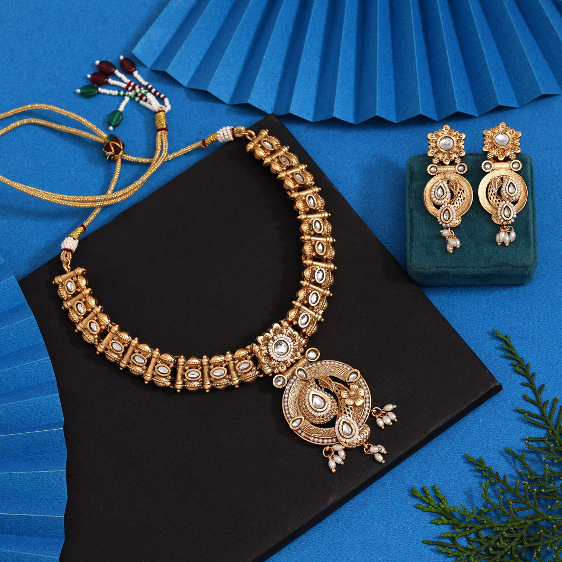 Gold Color Matte Gold Rajwadi Temple Necklace Set
