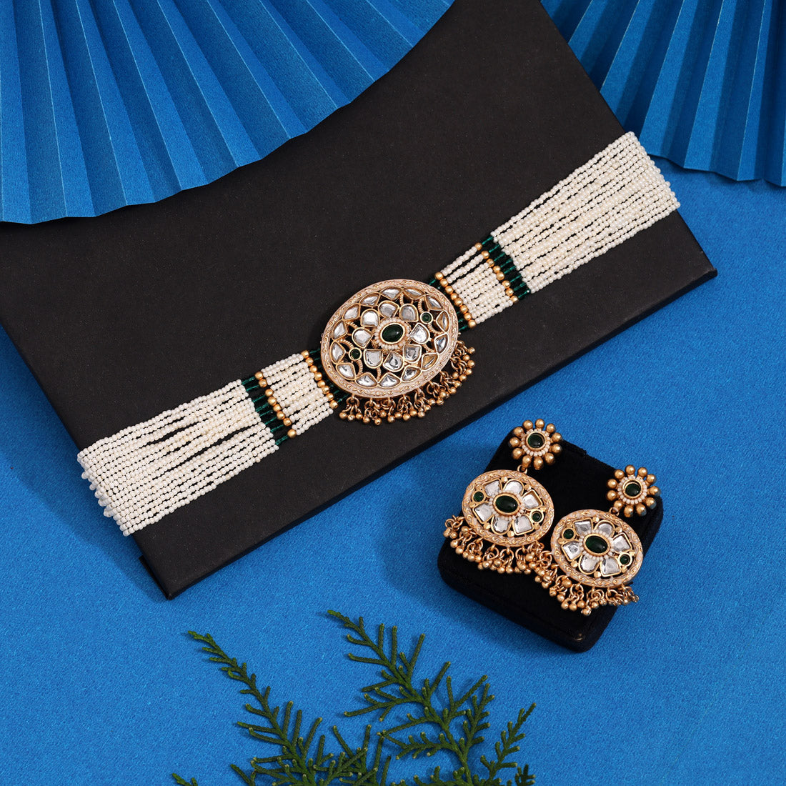 Green Color Choker Matte Gold Rajwadi Temple Necklace Set