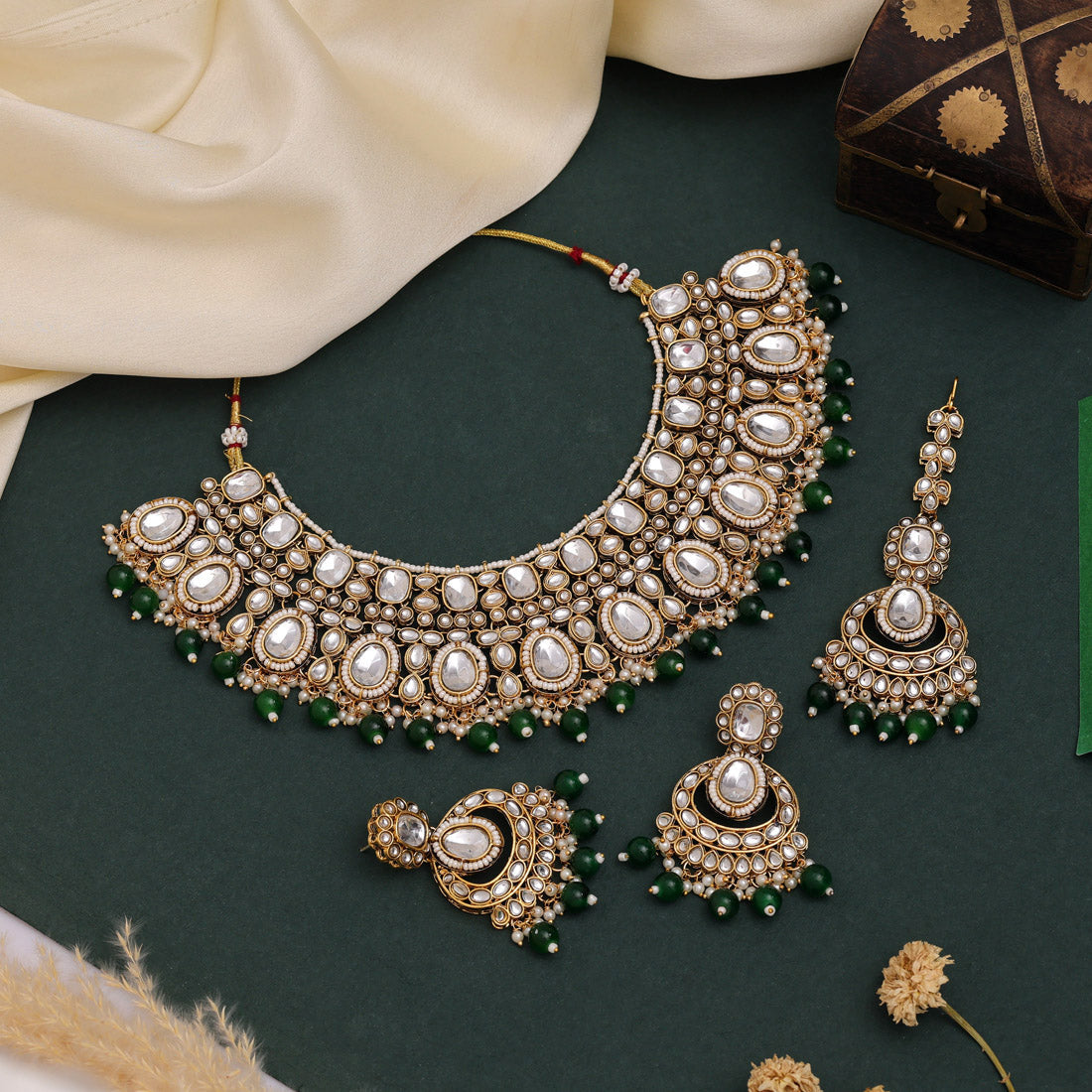 Traditional Green Color Kundan Necklace Set With Matching Earrings Design