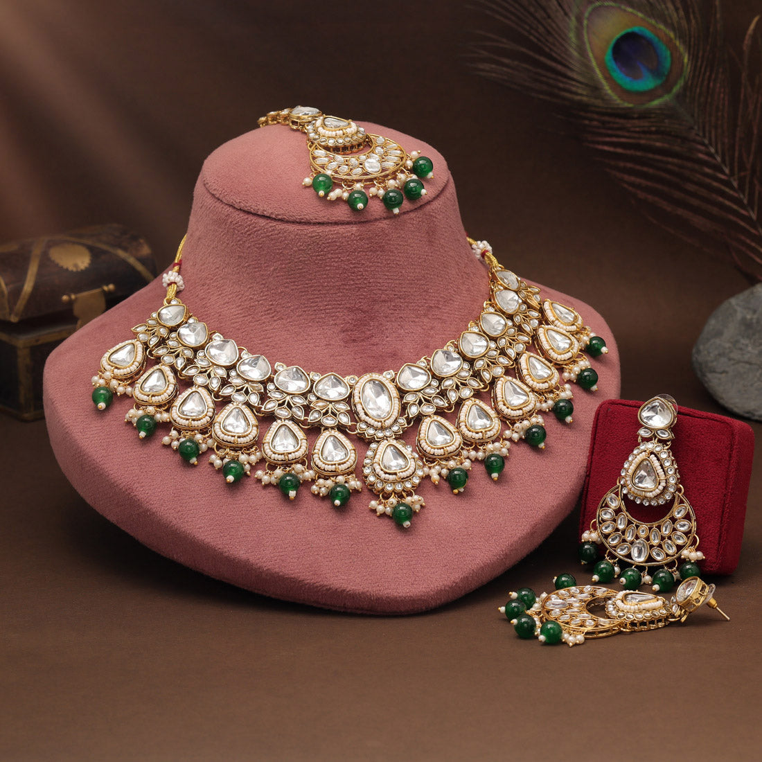 Green Color Kundan Necklace Set With Traditional Detailing And Charm
